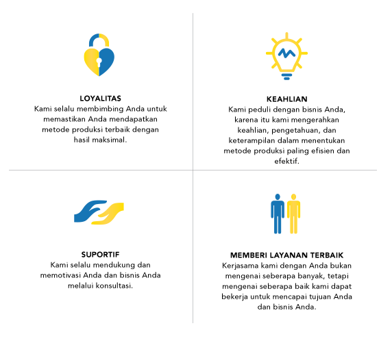 Agar Anda dapat menjalankan metode produksi yang paling efisien, kami memberi nilai lebih dengan menekankan pentingnya komunikasi dan partisipasi principal kami dalam menentukan produk-produk dengan kualitas terbaik. Kami berdiri di antara Anda dan principal kami, menghubungkan apa yang Anda butuhkan dan apa yang pricipal tawarkan.
